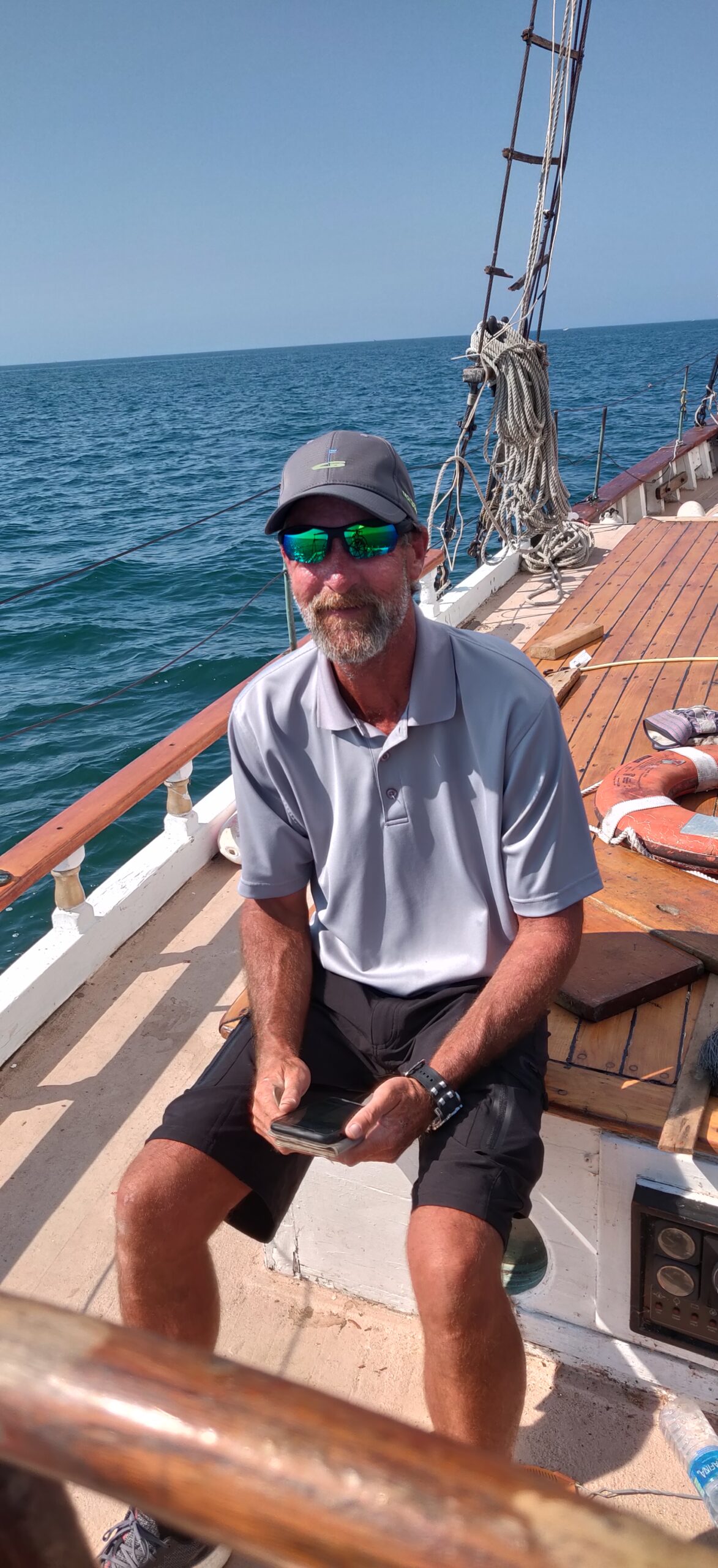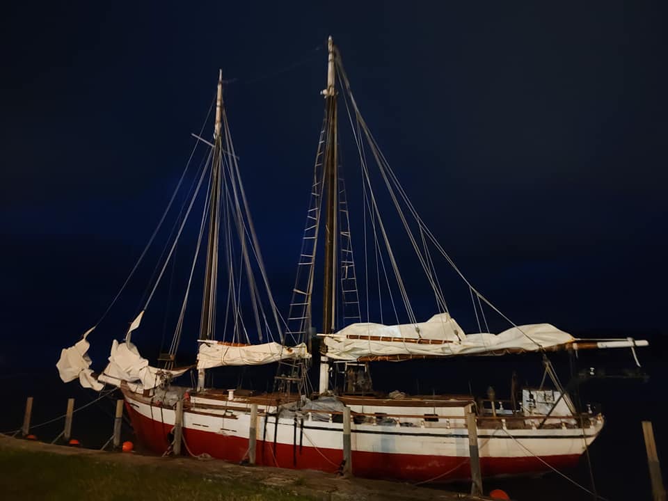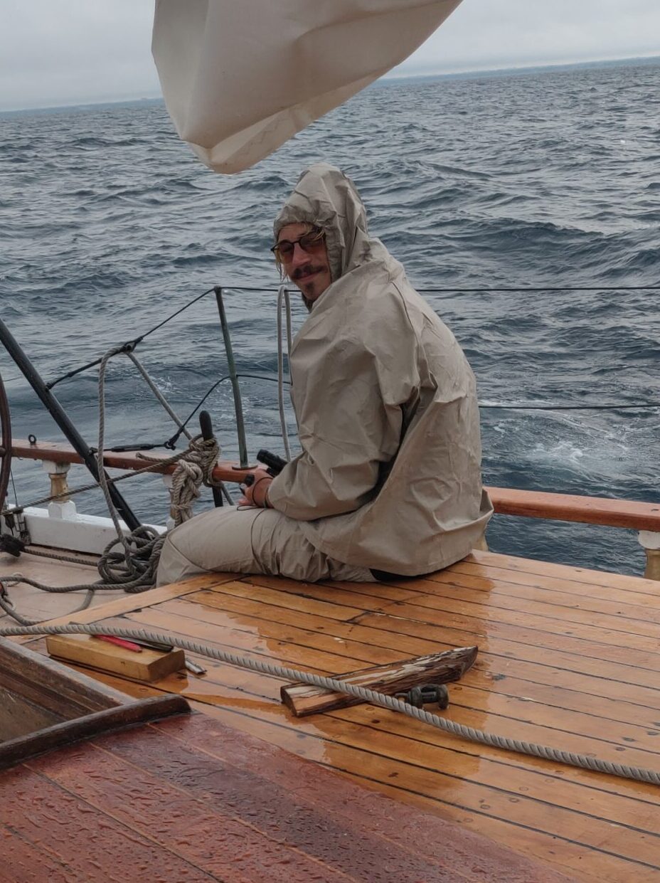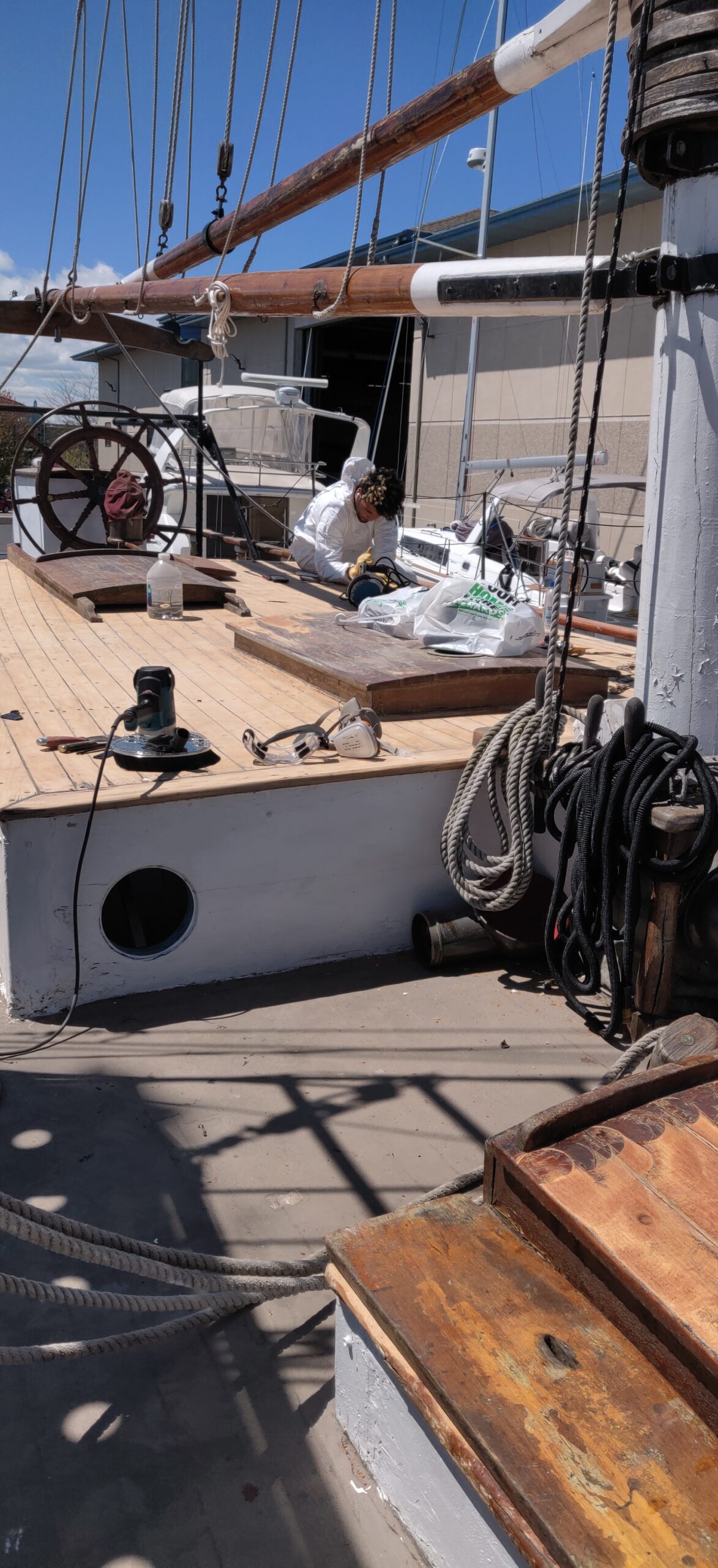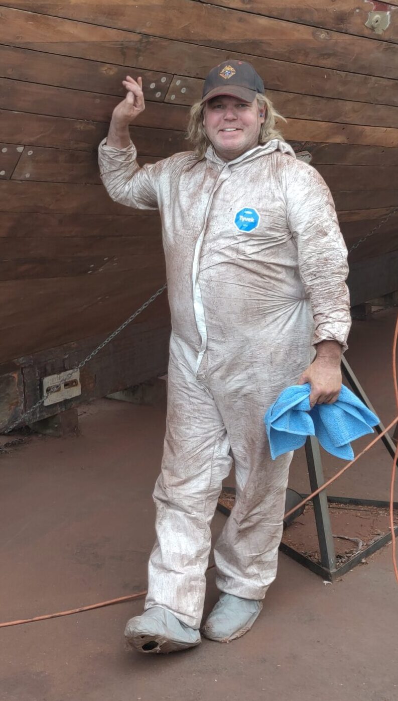 I’ve already mentioned shipwright Peter Little, who inspired us with his work and knowledge and kept us moving in the right direction. But there was Abbiey, Peter’s assistant, whose knowledge buttressed the overall renovation and whose painstaking attention to detail helped to make the hull sound. Weston Lorenz at One Source Staffing Inc. provided us a number of helpful workers, including Kayla and James, whom I thank. Nobody on the project was more indefatigable than Craig. We were in the water only because Craig literally spent days on his back with sawdust from a disk sander pouring down on him. In truth, however, everyone was instrumental in their own way. Bart led the way with the seam compound. Kathleen did a fantastic job of organization, among many other things recruiting the team that made the end-spurt possible: Matt, Flash, George, Michael and __, the Colon Family and Dylan. Thank you, Brandon, for your work, for the video footage and for sparing me embarrassment by climbing the ratlines at night to get the stuck mainsail down. Thank you, Kody, for painting both suspended and floating in the water after the boat had already been launched and for attaching the spreaders–from the manlift 50 feet up! Thank you, Jared, for the beautiful dutchmen. Thank you, Nick. Thank you, Mr. Debbink, for donating your carpentry skills. Thank you, Mr. Sorensen, for redesigning the exhaust system. Thank you, Captain John, for getting the spreaders back up.