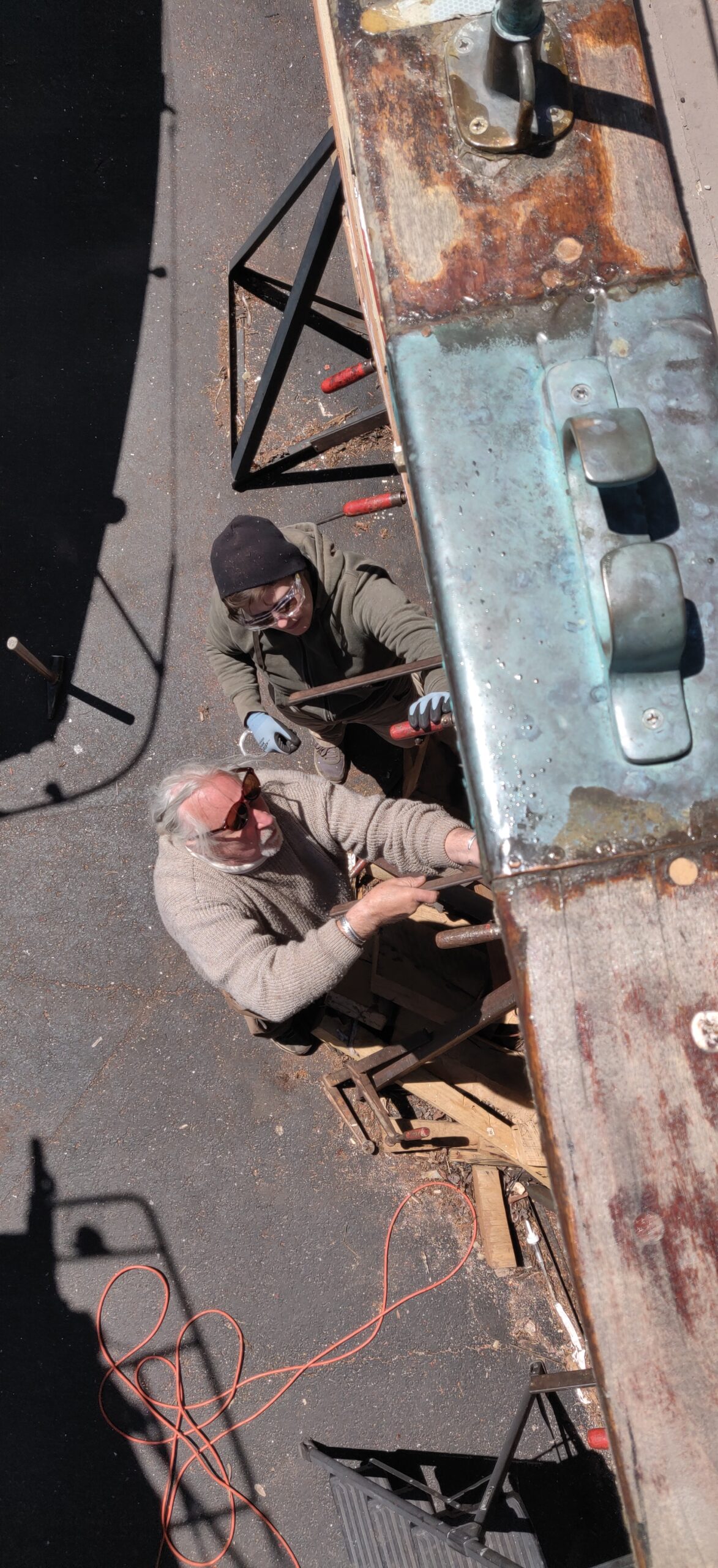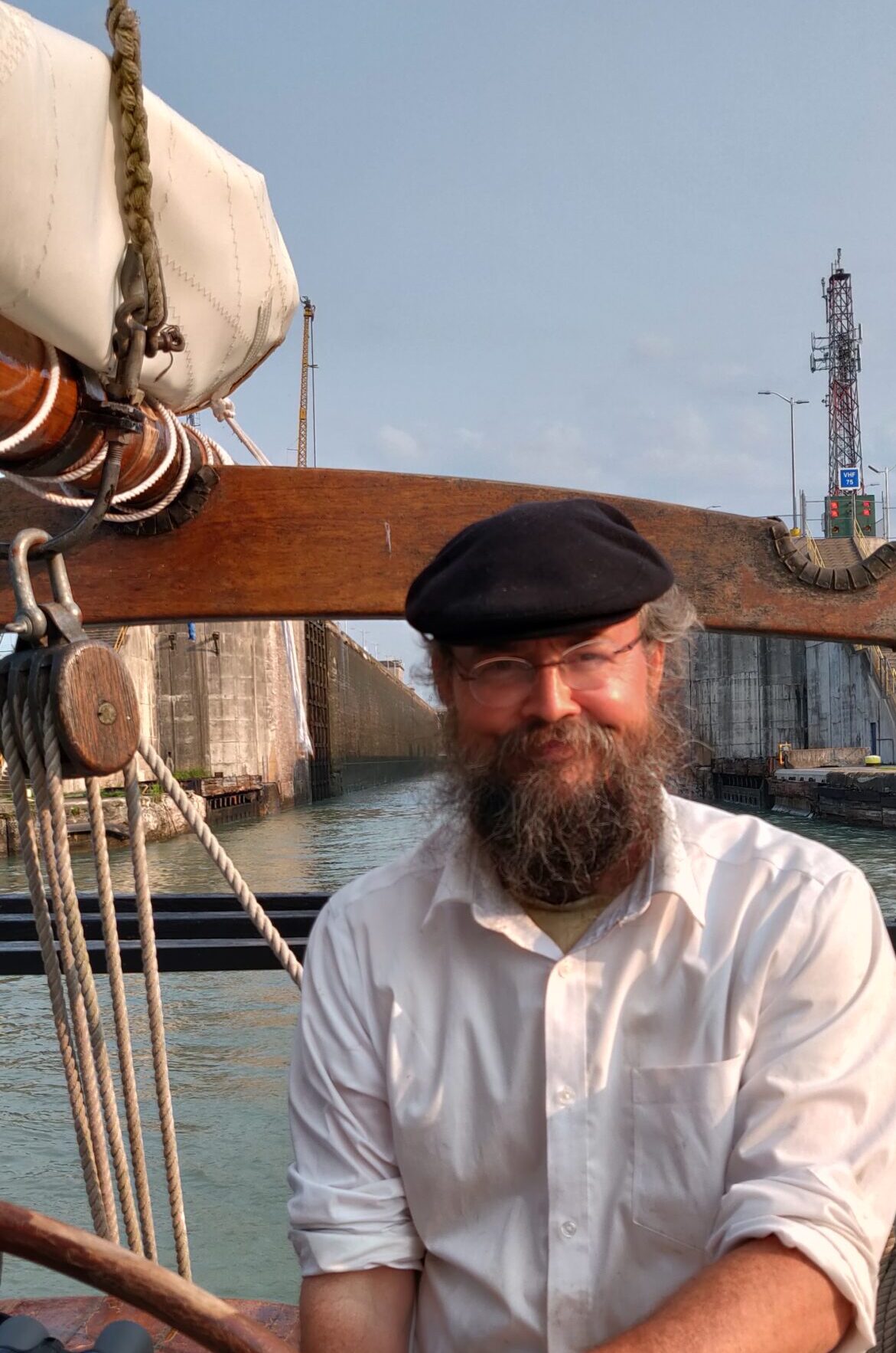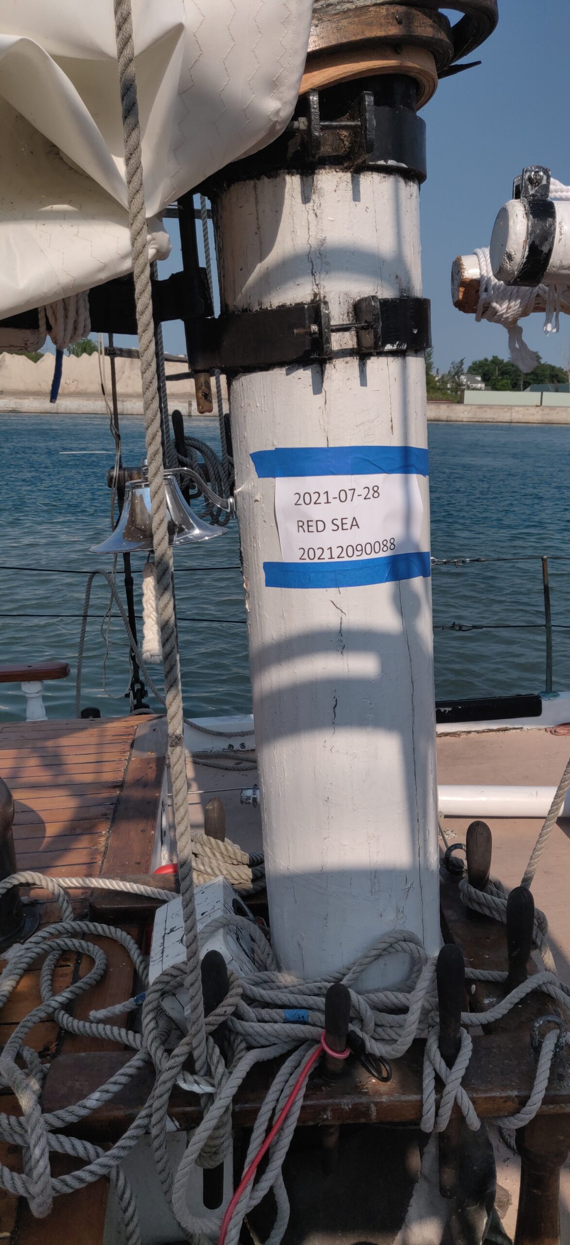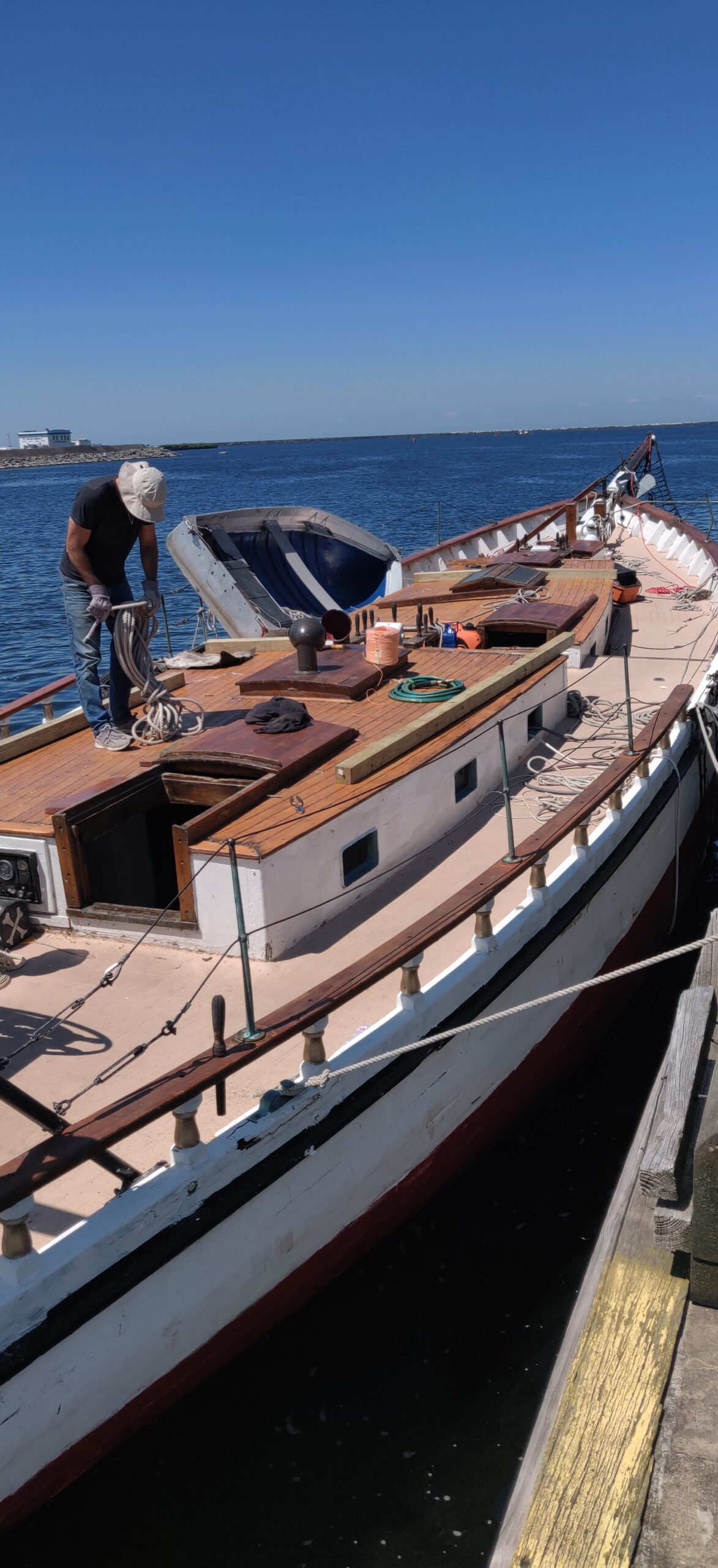 I’ve already mentioned shipwright Peter Little, who inspired us with his work and knowledge and kept us moving in the right direction. But there was Abbiey, Peter’s assistant, whose knowledge buttressed the overall renovation and whose painstaking attention to detail helped to make the hull sound. Weston Lorenz at One Source Staffing Inc. provided us a number of helpful workers, including Kayla and James, whom I thank. Nobody on the project was more indefatigable than Craig. We were in the water only because Craig literally spent days on his back with sawdust from a disk sander pouring down on him. In truth, however, everyone was instrumental in their own way. Bart led the way with the seam compound. Kathleen did a fantastic job of organization, among many other things recruiting the team that made the end-spurt possible: Matt, Flash, George, Michael and __, the Colon Family and Dylan. Thank you, Brandon, for your work, for the video footage and for sparing me embarrassment by climbing the ratlines at night to get the stuck mainsail down. Thank you, Kody, for painting both suspended and floating in the water after the boat had already been launched and for attaching the spreaders–from the manlift 50 feet up! Thank you, Jared, for the beautiful dutchmen. Thank you, Nick. Thank you, Mr. Debbink, for donating your carpentry skills. Thank you, Mr. Sorensen, for redesigning the exhaust system. Thank you, Captain John, for getting the spreaders back up.